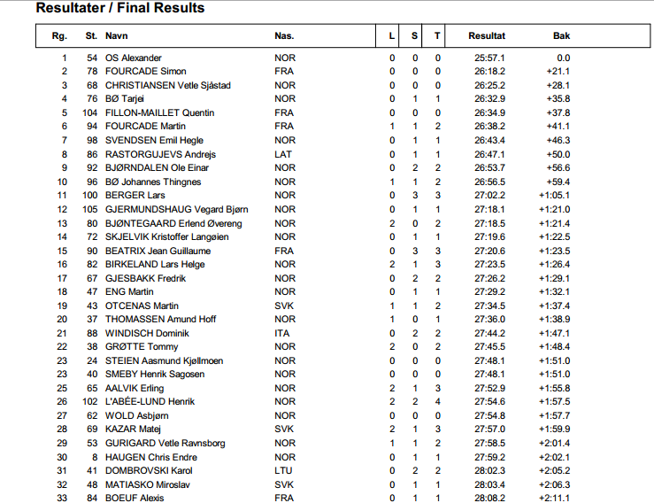 Najlepšie zo Slovákov sa umiestnil Martin Otčenáš s dvoma ranami mimo na 19. pozícií. Martin zhodnotil pre našu stránku svoje umiestnenie pozitívne: „Preteky boli ťažké a v náročných podmienkach, avšak rovnaké pre všetkých. Trať je náročná so strmými stúpaniami a zjazdmi. Nazývame ju motokros. Som spokojný so streľbou, aj keď posledná rana v ľahu ma trochu mrzí, keď som ju trochu strhol. Stojka mi vyšla ako tak. Podstatné je, že som obe položky odstrieľal v dobrom rytme a za krátky čas. Bežecky sa mi nedarilo zle, aj napriek tomu, že sme šli v príprave len dva rýchlejšie tréningy. Mám ešte rezervy v technike, ale myslím, že na prvý štart v takejto konkurencií som nepohorel. 30 sekúnd na Bjoerndalena nie je zlé a neušiel mi ani Svendsen. Myslím si, že sa to ešte zlepší a posunie vpred, keď prejdeme na špeciálne tréningy a začneme viac súťažiť.“