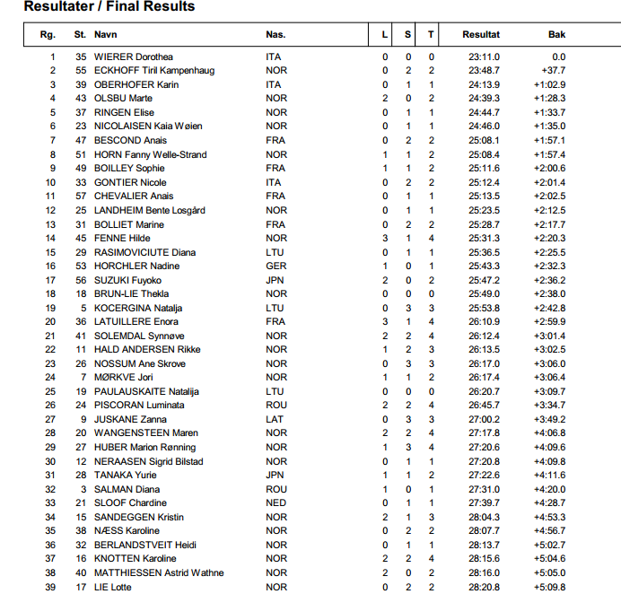 Medzi ženami dominovala Talianka Dorothea Wiererová, ktorá vďaka čistej streľbe na oboch streleckých položkách, jednoznačne súperky prevalcovala. S odstupom necelých 38 sekúnd prišla do cieľa druhá Tiril Eckhoffová z Nórska s dvoma chybami v streľbe v stoji. Tretie miesto vybojovala taktiež Talianka Karin Oberhoferová. Slovenské biatlonistky sa pretekov nezúčastnili.