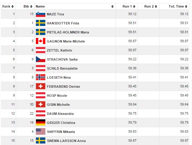 Levi – Náročnosťou je svah vo fínskom Levi považovaný za jeden z tých miernejších. Najrýchlejšou jazdou sa predviedla prekvapivo Tina Mazeová s časom 58.12, ktorá vyvrátila pochybnosti kritikov o jej aktuálnej forme. Slovinke pred troma týždňami začiatok sezóny nevyšiel, keď v obrovskom slalome skončila „až“ na 22. pozícii. Druhé miesto v prvom kole dnešného slalomu si vybojovala hneď prvá pretekárka na trati Frida Hansdotterová, ktorá zaostala za víťazkou o 39 stotín. So stratou +0.69 sa môže z 3. miesta tešiť ďalšia Švédka Maria Pietilae-Holmnerová.