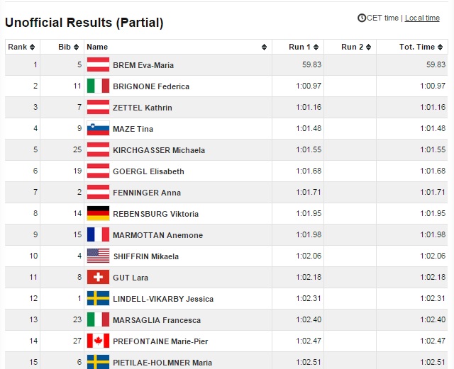 Aspen (USA) – Prvá polovica preteku je za nami. Rakúska blondínka Eva-Maria Bremová svojou pohotovou rýchlou jazdou nedala nádej svojim konkurentkám a ako jediná s časom pod jednu minútu zaslúžene vyhráva prvé kolo. Vyše sekundový náskok (+1.14) mala v cieli pred druhou pretekárkou Fredericou Brignonovou z Talianska. Priebežné tretie miesto si drží ďalšia Rakúšanka Kathrin Zettelová so stratou +1.13.