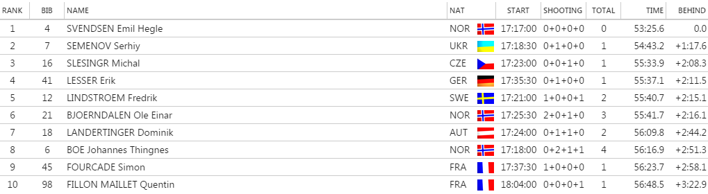 emil hegle svendsenNórsky reprezentant v biatlone Emil Hegle Svendsen vyčistil všetkých 20 terčov v individuále v rámci SP biatlonistov, ktorý sa koná vo švédskom Östersunde. Biatlonista z krajiny fjordov zvíťazil časom 53:25,6, o 1:17,6 prišiel za ním do cieľa Ukrajinec Serhiy Semenov s 1 trestnou minútou. Tretie miesto ukoristil český reprezentant Michal Šlesingr, ktorý zaznamenal 2 trestné minúty a čas o 2:08,3 pomalší ako víťaz.