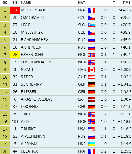 Držiteľ malého krištáľového glóbusu v tejto disciplíne nedal súperom šancu. Vďaka čistej streľbe a rýchlemu behu bude naskakovať do zajtrajších stíhacích pretekov s náskokom 28 sekúnd pred českým reprezentantom Ondřejom Moravcom, ktorý taktiež strieľal bezchybne, avšak bežecky na Francúza nestačil. Tretie miesto si vybojoval Slovinec Jakov Fak.
