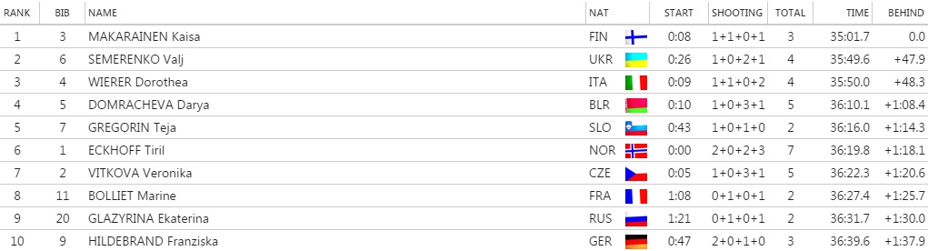 Prvých 5 pretekárok na štarte sa zmestilo do 10 sekúnd – 1. Eckhoffová, 2. Vítková (+5), 3. Mäkäräinenová (+8), 4. Wiererová (+9), 5. Domračevová (+10). To zaručovalo, že dnes budeme mať v stíhačke o zábavu postarané. Slovenky štartovali s čislami pomerne vzadu 39 Gereková (+1:54) a 48 Poliaková (+2:10), čím v podstate už od štartu nemali príliš veľké šance na popredné umiestnenie. Spomínaných 5 pretekárok sa spojilo a na prvom okruhu nám vznikla vpredu veľmi silná skupina. Po prvej streľbe sa toho až tak veľa nezmenilo, keď tesne viedla Vítková s jednou chybou pred Mäkäräinenovou a Wiererovou s rovnakým počtom zaváhaní. Druhú streľbu perfektne zvládla Darya Domračevová, ktorá sa dostala do čela s minimálnym odstupom na Vítkovú. Kartami najviac zamiešala tretia streľba, kde sa zdvihol vietor a pretekárky začali chybovať. Kaisa Mäkäräinenová vyčistila všetky terče, čím si pripravila základ na svoje víťazstvo. Stíhať ju mohli ešte Wiererová s nulou a Eckhoffová, ale plavovlasá Fínka sa im vzďalovala na každom medzičase. Na poslednej streľbe si Mäkäräinenová mohla dovoliť jednu chybu, ktorú si aj dovolila. Vďaka rýchlym nohám a perfektnej tretej streľbe si vybojovala víťazstvo v dnešných pretekoch pred Dorotheou Wiererovou a Valj Semerenkovou.