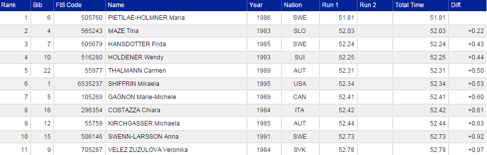 S nástrahami trate prvého kola slalomu Svetového pohára v alpskom lyžovaní vo švédskomn Aare si najlepšie poradila domáca Maria Pietilä-Holmnerová časom 51,81 sekundy. V druhom kole jej bude dýchať na chrbát priebežne druhá víťazka včerajšieho obrovského slalomu Tina Mazeová zo Slovinska s mankom 22 stotín. Prvú trojku po prvom kole uzatvára Pietilä-Holmnerovej krajanka Frida Hansdotterová, ktorá má zatiaľ stratu 0,43 sekundy.