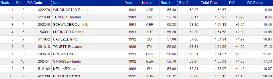 Zvíťazil už spomínaný Nór Rasmusa Windigstad súčtom času 1:53,67 pred Thomasom Tumlerom zo Švajčiarska (+0,26) a Dominikom Schwaigerom z Nemecka (+0,51).