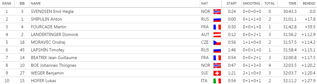 Dnešné stíhacie preteky na 12,5 km Svetového pohára v biatlone opanoval so štyrmi nulami strieľajúci Emil Hegle Svendsen z Nórska časom 30:43,3. Týmto husárskym kúskom vyzliekol zo žltého trička priebežne vedúceho pretekára v celkovom poradí Martina Fourcada. Na druhom mieste sa umiestnil víťaz včerajšieho šprintu Anton Šipulin z Ruska s bilanciou 0+1+1+0 a mankom 17,8 sekundy. Tretí dorazil do cieľa už spomínaný Martin Fourcade z Francúzska, ktorý spravil len jednu chybu na prvej streleckej položke v stoji. Jeho výsledný čas bol o 59,5 sekundy pomalší ako víťazný a stálo ho to vedenie v celkovom poradí.