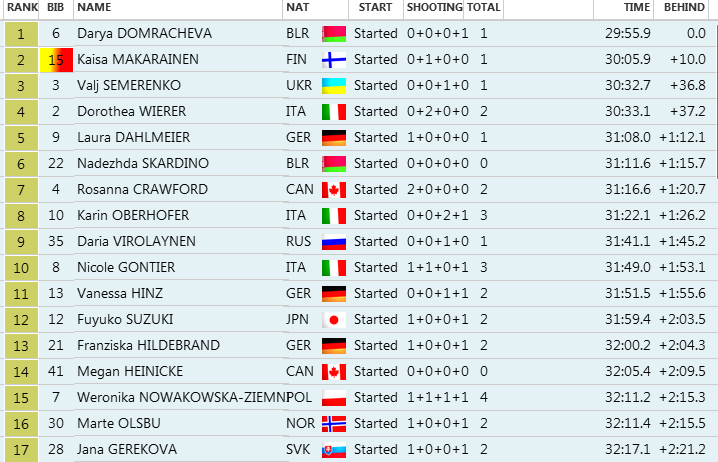 Druhé miesto si vybojovala vedúca žena SP Kaisa Mäkäräinenová, ktorá štartovala až s číslom 15. Súboji o tretie miesto vyšiel lepšie pre Ukrajinku Valj Semerenkovú, ktorá mala vo finiši viac síl ako Talianka Dorothea Wiererová.