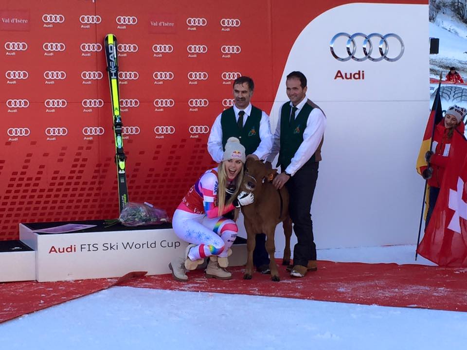 Zaujímavosťou je, že Lindsey Vonnová za svoje víťazstvo dostala ako darček kravičku Winnie (na snímku).