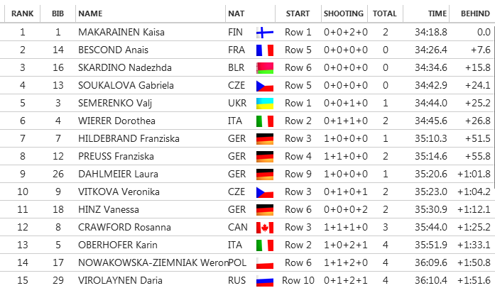 V premiérových pretekoch s hromadným štartom v sezóne zvíťazila po skvelom bežeckom výkone Fínka Kaisa Mäkäräinenová. Pre vedúcu ženu Svetového pohára to bolo vôbec prvé víťazstvo v tomto type preteku. Fínka na trati doslova lietala a aj napriek dvom trestným kolám nedala svojim súperkám šancu. Jej najväčšia konkurentka Daria Domračevová z pretekov odstúpila po páde, keď sa zrazila s Francúzkou Justine Braisazovou.