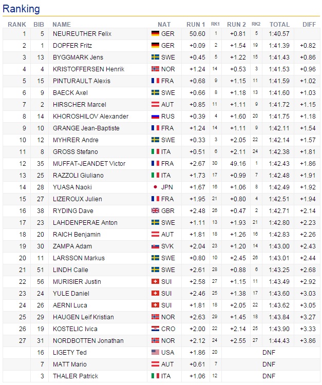 Madonna di Campiglio, Taliansko – Sympatický Nemec Felix Neureuther zvíťazil v druhom slalome aktuálneho ročníka SP, keď po suverénnej jazde v prvom kole potvrdil svoju momentálnu formu, v druhom kole nenechal nič na náhodu a zaslúžene zvíťazil. Druhý skončil rovnako ako v prvom kole jeho krajan Fritz Dopfer. Tretie miesto si možno trocha prekvapujúco vybojoval Švéd Jens Byggmark, pre ktorého je to len druhé pódiové umiestnenie vo Svetovom pohári v jeho doterajšej kariére.