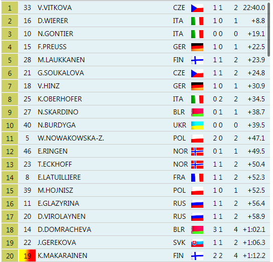 Vedúcej žene Svetového pohára Kaise Mäkäräinenovej sa strelecky nedarilo a na trestnom kole krúžila dovedna štyrikrát. Do cieľa prišla na konečnej 20. priečke.