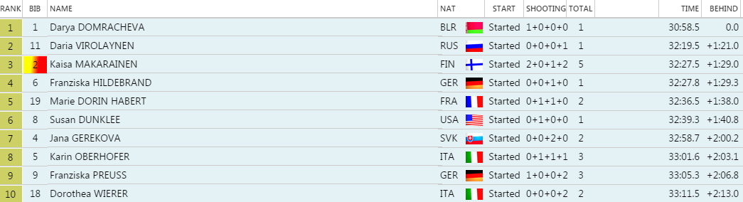 Martina Chrapánova ani Terézia Poliaková, žiaľ, nebodovali, keď obidve zaznamenali dovedna 5 chýb. Prvá z menovaných obsadila 45. priečku so stratou 5:34,0 a streleckou bilanciou 2+1+1+1. Terézia Poliaková strieľala s bilanciou 1+1+2+1 a do cieľa dorazila o 7:35,2 neskôr ako Domračevová.