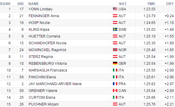 Sympatická 30-ročná pretekárka z Vailu opanovala tieto preteky časom 1:23,55, keď druhú obhajkyňu celkového prvenstva Annu Fenningerovú z Rakúska porazila o 0,24 sekundy. Na stupne víťazov sa postavila ešte Fenningerovej krajanka Nicole Hospová, ktorá zaznamenala stratu 1,10 sekundy na víťazku.