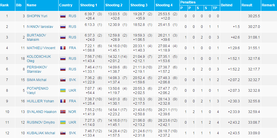Stíhacie preteky mužov boli na programe pred ženskými a kompletne v nich obsadili stupne víťazov ruskí reprezentanti na čele s bezchybným Jurim Šopinom pred Jaroslavom Ivanovom a Maksimom Burtasovom. Slováci sa taktiež nestratili, keď Michal Šíma obsadil 7. miesto a Michal Kubaliak 12. pozíciu. Henrich Lonský bol 27. a René Bevelaqua 30., pričom Juraj Valenta nedokončil preteky.