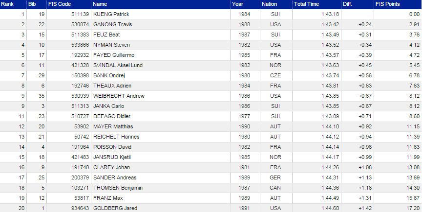 Výsledky zjazdu mužov na amerických Majstrovstvách sveta v alpskom lyžovaní: