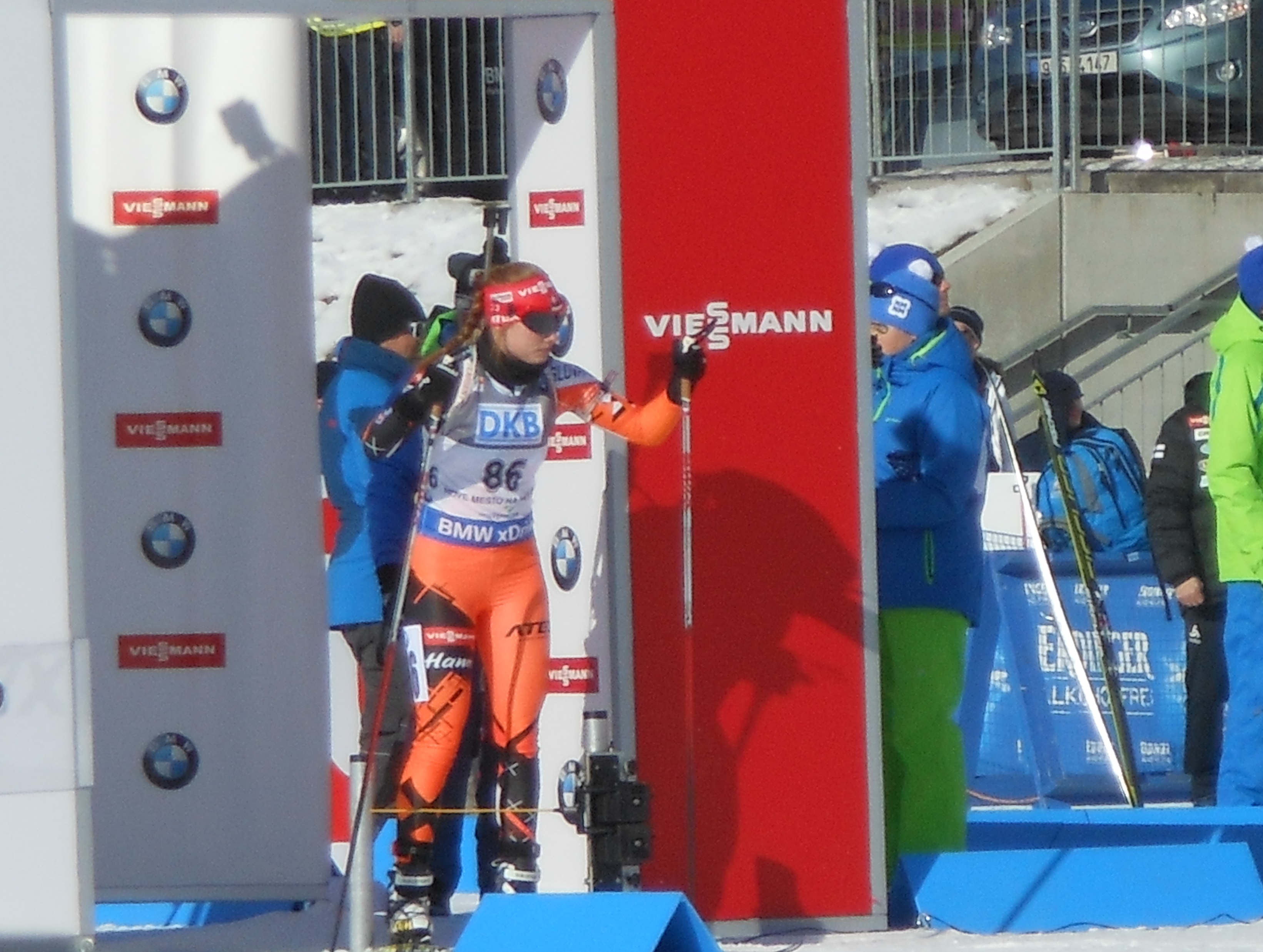 Nedeľa nás prekvapila premenlivým počasím už počas presunu z hotela na štadión. Na dopravnú zápchu sme si už zvykli, takže sme cestovali už o čosi skôr. Uvideli sme štadión, kde akurát panovala víchrica. Naše kroky smerovali k nemu a samozrejme našli sme si svoje miesta v hľadisku. Vypukli stíhacie preteky žien v zmienenej premenlivej poveternostnej situácii, ktoré dopadli najlepšie pre bieloruskú reprezentantku s ladným štýlom behu Dariu Domračevovú pred fínskou víchricou Kaisou Mäkäräinenovou a víťazkou šprintu Laurou Dahlmeierovou. Triumfálny dojazd Bielorusky sme pre Vás nahrali a zverejnili na našom facebooku. Janka Gereková zaznamenala v tomto zápolení pekný posun o 16 priečok zo štartovej pozície číslo 32 na 16. miesto v cieli. Paulína Fialková so 43 sa posunula o 1 priečku nahor, keď obsadila 42. post.  Následne sme sa išli trocha poprechádzať po okolí a navštívili sme fanúšikovský stan.20150208_142726