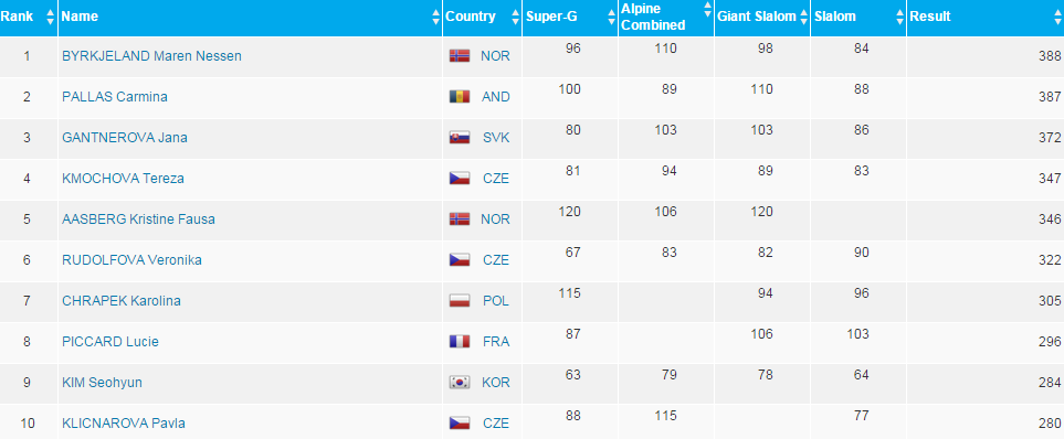 Túto klasifikáciu vyhrala Nórka Maren Nessen Byrkjelandová, ktorej výsledok mal hodnotu 388 bodov. Na striebornej priečke sa umiestnila reprezentantka Andorry Carmina Pallasová, ktorá si do hodnotenie pripísala celkovo 372 bodov.