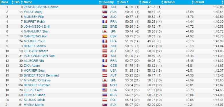 Zlatom svoje konto zaťažil ostrieľaný Švajčiar zo Svetového pohára Ramon Zenhaeusern, ktorý predstihol svojich súperovi časom 1:35,86 o parník. Bronz putuje do Slovinska zásluhou Filipa Mlinseka, ktorého náš reprezentant porazil v mikrosúboji o 5 stotín.