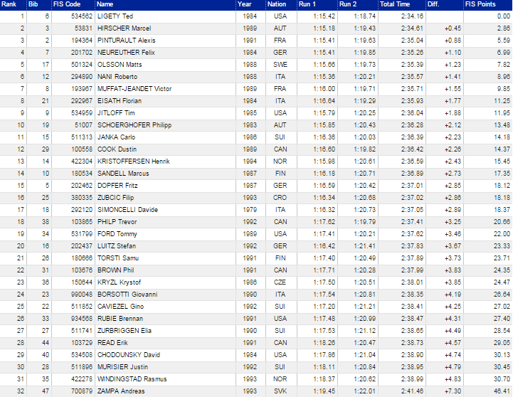 Slovenský reprezentant Andreas Žampa skončil tesne pod top 30 na 32. mieste a stratil spolu 7,30 sekundy na amerického pretekára. Jeho starší brat Adam Žampa, nanešťastie, neprišiel do cieľa prvej jazdy, keďže vypadol po druhom medzičase.