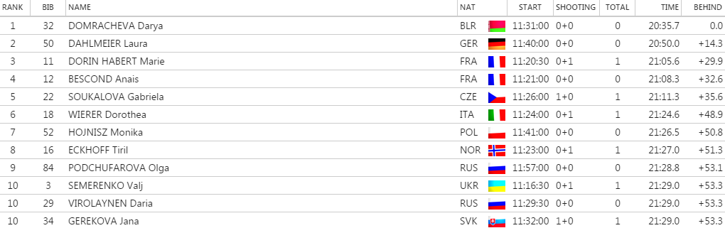 Martina Chrapánová po čistej streľbe prišla do cieľa na 44. poste a nestačila na Domračevovú o 1:39,1. Rovnakú streleckú bilanciu mala Terézia Poliaková, no, žiaľ, ani jej to pri strate 2:05,4 nevyšlo na body.