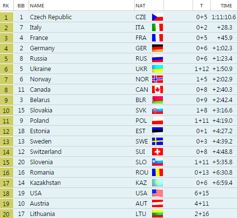 Najlepší výsledok v sezóne si pripísali slovenské biatlonistky, keď obsadili 10. priečku s odstupom 3:16,6 sekundy a streľbou 1+8. Naše dievčatá bežali v zložení Paulína Fialková (0+1), Jana Gereková (0+2), Terézia Poliaková (0+2) a Martina Chrapánová (1+3), pričom sa v podstate od začiatku pretekov držali v najlepšej desiatke. Paulína Fialková zápasiaca s chorobou mierne bežecky strácala, ale svoju pozíciu si zastala veľmi dobrou streľbou s jedným dobíjaním na prvej streľbe. Jana Gereková jazdiaca vo veľmi dobrej forme dokázala slovenskú štafetu vyšvihnúť až na 7. priečku, keď dobíjala dvakrát na stojke. Rovnaký počet dobíjaných nábojov potrebovala na streľbe v stoji kvalitná Terézia Poliaková, ktorá odovzdávala štafetu na rovnakom mieste ako jej predchodkyňa. Výborne začala finišmanka štafety Martina Chrapánová s nulou na prvej streľbe a držala naše nádeje vysoko. Na poslednú streleckú položku prišla spoločne s Ukrajinkami a Nórkami na dohľad 6. pozície, no tam musela absolvovať jeden trestný okruh. Celkovo to aj tak vyšlo na spomínaný desiaty post a pred MS v Kontiolahti sa Slovenky ukázali v slušnej forme.