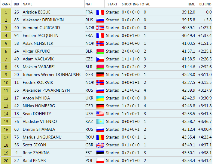 V štartovnom poli 93 biatlonistov sa jediný slovenský zástupca v poli Ondrej Kosztolányi umiestnil na 52. mieste s bilanciou 0+3+1+1 a stratou +8:41.4.