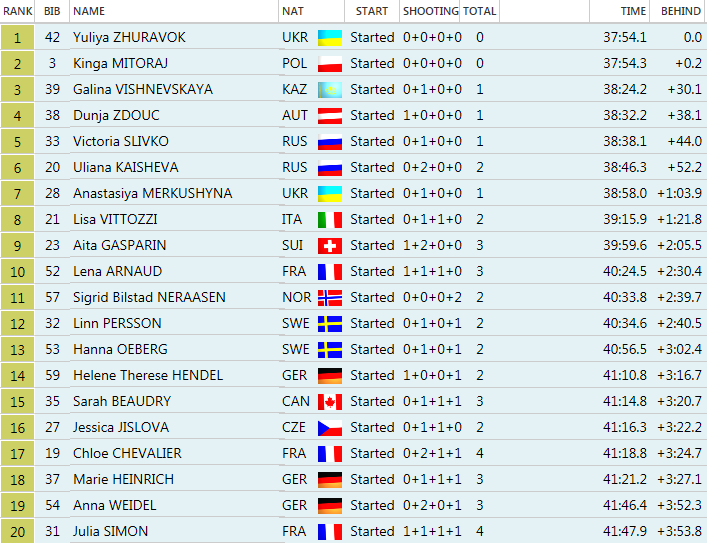 Jediná slovenská zástupkyňa Ivona Fialková sa umiestnila v konkurencií 63 pretekárok na 43. mieste. Na strelnici spravila dovedna až 7 chýb (2+3+2+0) a do cieľa prišla so stratou +7:55.8 na víťazku.