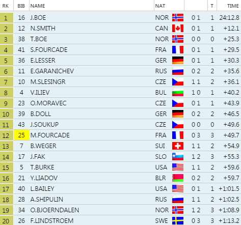 Dnes striebornou pozíciou pomerne prekvapil Nathan Smith z Kanady, s ktorým sa až tak nerátalo na priečky zaručujúce medaily. Kanaďan netrafil síce jeden terč na streľbe v stoji (0+1), ale vďaka behu sa dokázal vyšvihnúť až k výšinám so stratou 12,1 na víťaza. Rodina Boeovcov dnes bude oslavovať dva cenné kovy, keďže starší Tarjei s čistou streľbe prišiel do cieľa ako bronzový so stratou 25,3 sekundy na svojho brata.