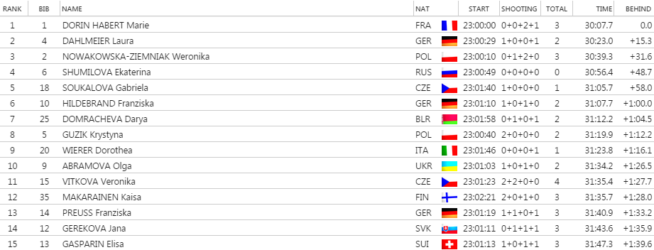 Janka Gereková opäť predviedla kvalitný výkon, pričom preťala cieľovú pásku pri bilancii 0+1+1+1 ako 14. v poradí s odstupom 1:35,9. Po prvej streľbe sa súčasná slovenská jednotka držala dokonca na 5. poste, no po chybičkách na ostatných položkách obsadila spomínané 14. miesto. Martina Chrapánová mohla dnes pomýšľať aj na bodíky, no, žiaľ, vyštartovala o čosi skôr. Kvôli tomu bola penalizovaná 30 sekundami a skončila 43. so stratou 5:03,9. Trio Sloveniek uzatvára Terézia Poliaková, ktorá sa umiestnila na 49. priečke pri bilancii 1+0+2+2 a časovom nedostatku 6:05,7.