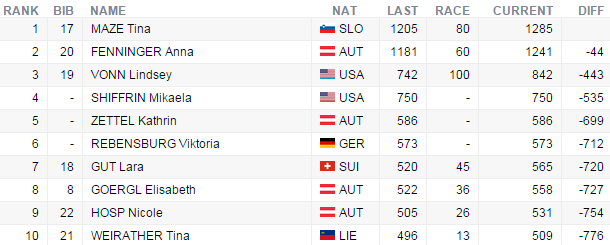Napínavý boj zvedú pretekárky aj o veľký krištáľový glóbus, keďže aktuálne čelu celkového poradia vojvodí Tina Mazeová s 1285 bodmi s len 41 bodovým predstihom pred Annou Fenningerovou.