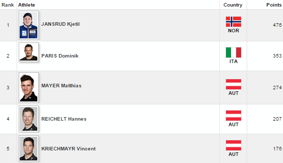 Super-G mužov opanoval už v predstihu Kjetil Jansrud z Nórska, keďže si vybojoval nedostihnuteľný náskok 123 bodov pred zástupcom “azúrovej squadry” Dominikom Parisom.