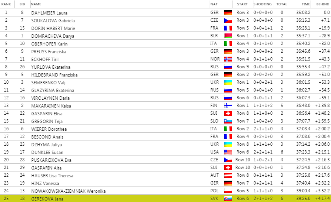 Jediná Slovenka v štartovom poli Janka Gereková preťala cieľ na 25. poste s odstupom 4:17,4, keď jej ostalo “visieť” 6 terčov (2+1+1+2).