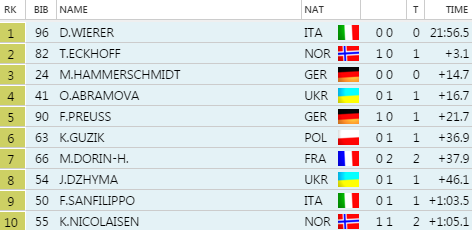 V dobre obsadených pretekoch prišiel do cieľa na 7. mieste s odstupom 1:05,1 na víťazného Simona Schemppa, pričom netrafil dva terče na streľbe v stoji. Po prvej streľbe bol dokonca druhý v poradí, keď ho na nej predstihol len domáci matador Tarjei Boe.