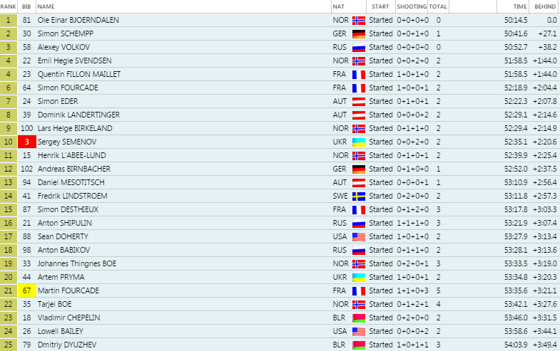 Druhý skončil rýchly bežec Simon Schempp z Nemecka, ktorému v cieli namerali čas o 27,1 sekundy pomalší ako Bjoerndalenovi. Stupne víťazov doplnil čarostrelec Alexej Volkov, keď zaostal za nórskou legendou o 38,2 sekundy pri čistej streľbe.
