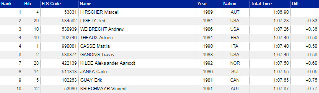 Druhé miesto obsadil jeho dlhoročný sok najmä v obrovskom slalome domáci Ted Ligety (+0,33) pred kolegom z reprezentácie Andrewom Weibrechtom (+0,36).
