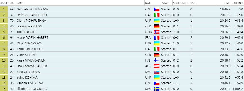 Veľmi kvalitne si počínala Jana Gereková, ktorá figurovala po druhej streľbe po dvoch nulách dokonca na štvrtom mieste. Nakoniec jej to v natesnanej výsledkovej listine stačilo na veľmi dobrú 12. priečku pri odstupe 53,8 sekundy. Na stupne víťazov však stracála len 15,4 sekundy, čo je skvelá východisková pozícia do zajtrajšej “stíhačky”.