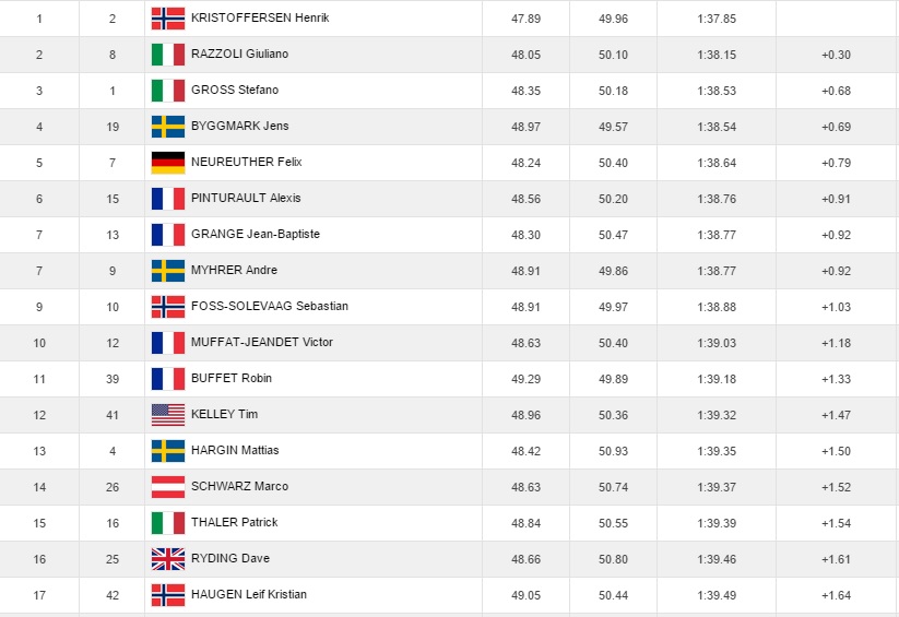 Mladý nórsky lyžiar  Kristoffersen suverénne vedie rebríček slalomárov s počtom 480 bodov, druhý v rebríčku Marcel Hircher, ktorý má len 340 bodov si neprilepšil, keď v druhom kole preteky nedokončil.