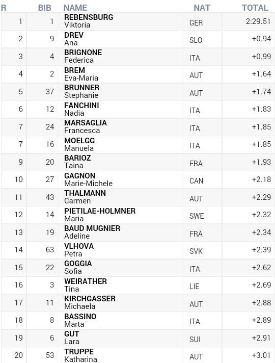 Vyhrala Viktoria Rebensburgová z Nemecka pred Anou Drevovou zo Slovinska a Federicou Brignoneovou z Talianska.