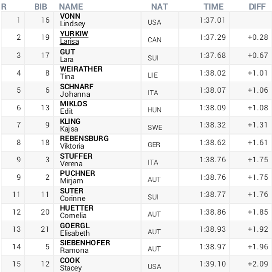 Druhá skončila v dobrej forme jazdiaca Larissa Yurkiwová z Kanady s odstupom 0,28 sekundy a vyrovnala svoje kariérne maximum z minulotýždňového Altenmarktu. Stále vedúca žena SP Lara Gutová doplnila stupne víťazov so stratou 0,67 sekundy a vedie už len o 10 bodov pred Vonnovou.
