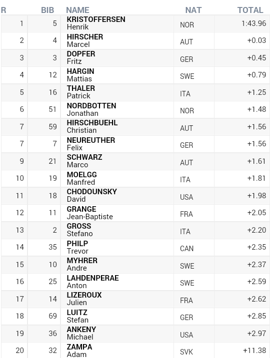 Po prvom kole bol mladý Nór klasifikovaný na 12. mieste s odstupom 0,83 sekundy na Fritza Dopfera. V druhej jazde predviedol najrýchlejší čas a po zásluhe ovládol celé preteky. Je to už jeho 5. slalomové víťazstvo v ročníku a celkovo 9. v kariére.
