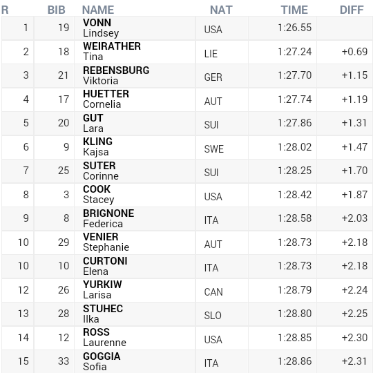 Jediná žena, ktorá sa dostala pod sekundu straty na víťazku, bola Tina Weiratherová z Lichtenštanjska na druhom mieste s odstupom 0,69 sekundy. Tretia Viktoria Rebensburgová z Nemecka stratila na Vonnovú 1,15 sekundy.