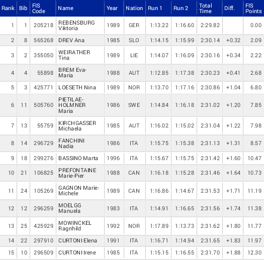 Nemka bola po prvom kole druhá a zásluhou veľmi dobrej druhej jazdy sa posunula na najvyšší stupienok. Pre olympijskú víťazku z Vancouveru 2010 je to druhý primát v “obráku” v rade a celkovo 12. kariérne víťazstvo.