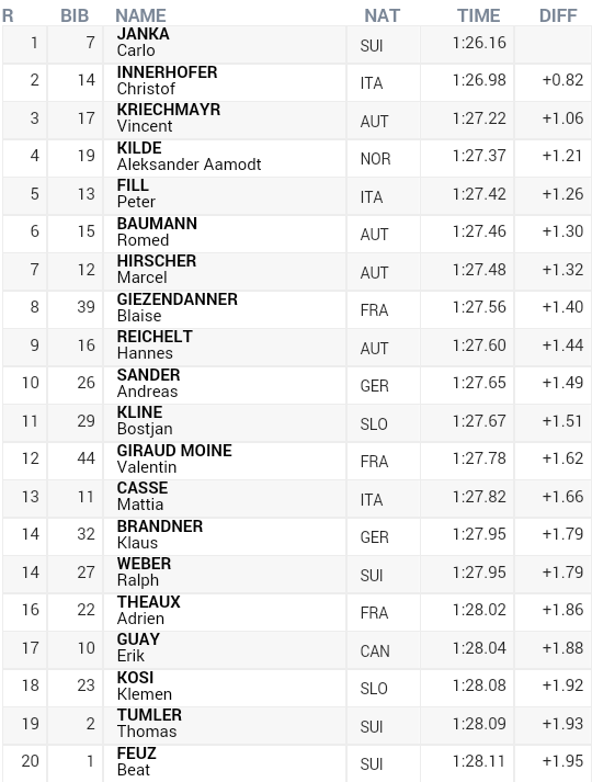 Druhú pozíciu ukoristil Christof Innerhofer z Talianska, ktorý na víťaza nestačil o 0,82 sekundy. Na “bedňu” sa postavil aj Vincent Kriechmayr z Rakúska a jeho odstupom sa vyšplhal už nad sekundu (+1,06).