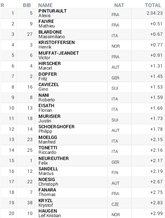 Druhé miesto si odnáša Pinturaultov krajan Mathieu Faivre, ktorý mal v cieli odstup 0,51. Na stupne víťazov sa dostal aj taliansky veterán Massimiliano Blardone, pričom mu namerali stratu 0,67.