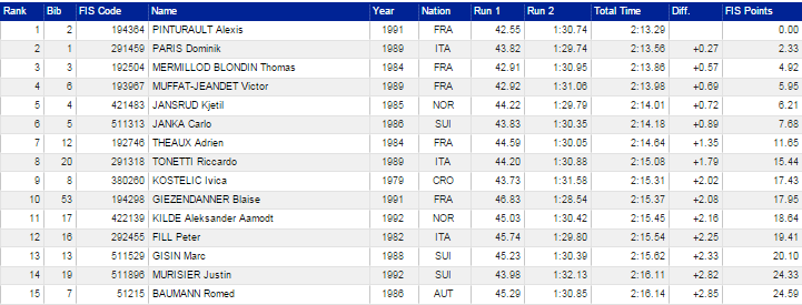 Druhý dnes skončil Dominik Paris (+0,27), ktorý bol najrýchlejší v zjazdárskej časti. Stupne víťazov doplnil spomínaný Thomas Mermillod Blondin s odstupom 0,57 sekundy.