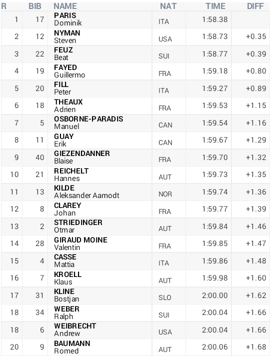 Druhé miesto patrilo zástupcovi americkej lyžiarskej školy Stevenovi Nymanovi, ktorý nestačil na Taliana o 0,35 sekundy. Švajčiar Beat Feuz si vybojoval taktiež stupne víťazov a na treťom mieste mal odstup 0,39 sekundy.