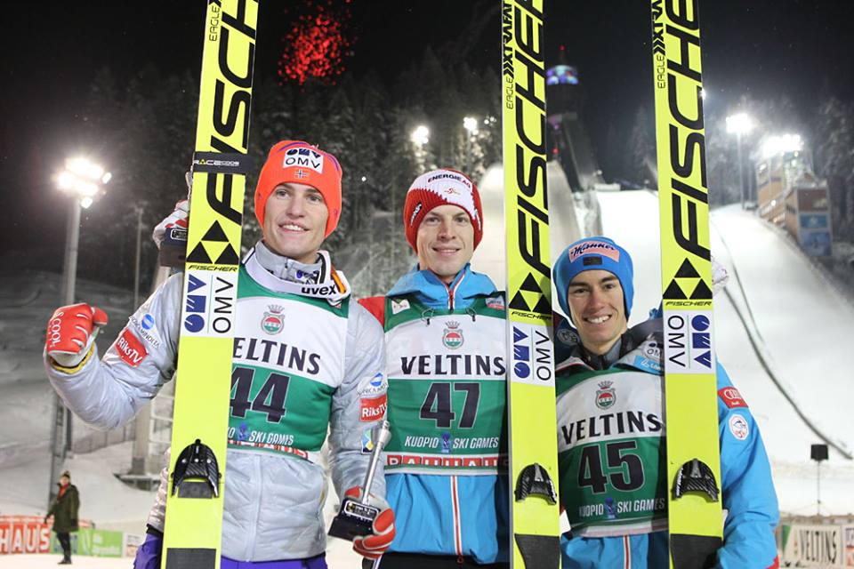 Rakúsky skokan na lyžiach Michael Hayböck zavŕšil vo Fínsku hetrik. V utorňajších pretekoch na mostíku v Kuopiu si so skokmi o dĺžke 131 a 129 metrov pripísal svoje štvrté víťazstvo v kariére, tretie v rade. Na druhom mieste skončil Nór Daniel Andre Tande. Tretiu priečku obsadil ďalší rakúsky skokan Stefan Kraft.