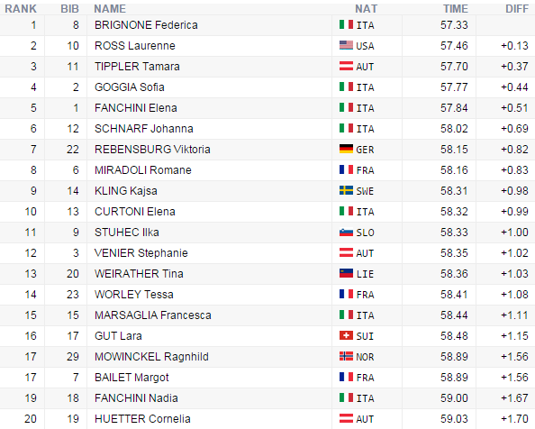 Druhé miesto obsadila Laurenne Rossová z USA, ktorá za Brignoneovou skončila o 0,13 sekundy. Na “bedňu” sa postavila aj tretia Tamara Tipplerová z Rakúska a stratila 0,37 sekundy.