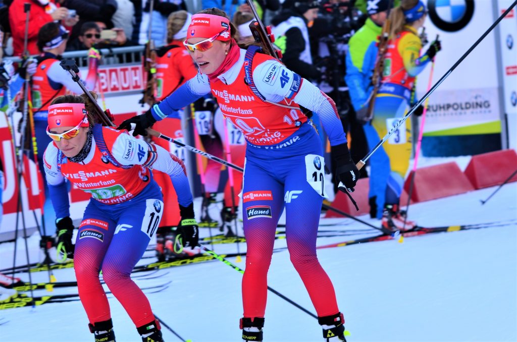 Zo Sloveniek odštartovala štafetu Ivona Fialková, ktorá musela využiť pri prvej streľbe všetky tri náhradné náboje a usadila sa na 19. mieste. V „stojke“ dobíjala len raz a svoju staršiu sestru Paulínu Fialkovú vyslala na trať z 16. priečky. Rodáčka z Čierneho Balogu pri streľbe v ľahu potrebovala tri náhradné náboje. Pri druhej návšteve strelnice musela dobiť jeden náboj a štafetu odovzdávala na 17. mieste.