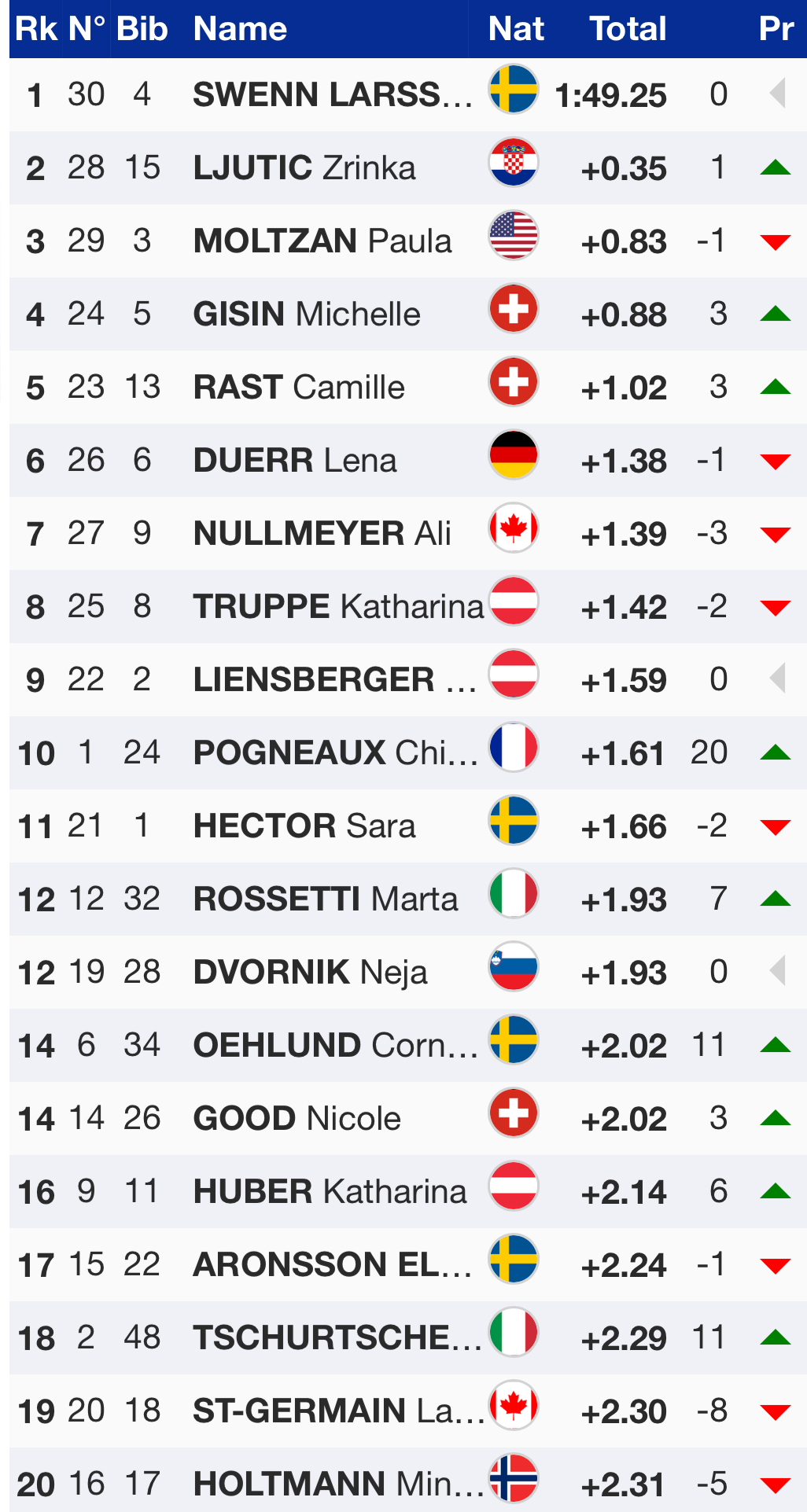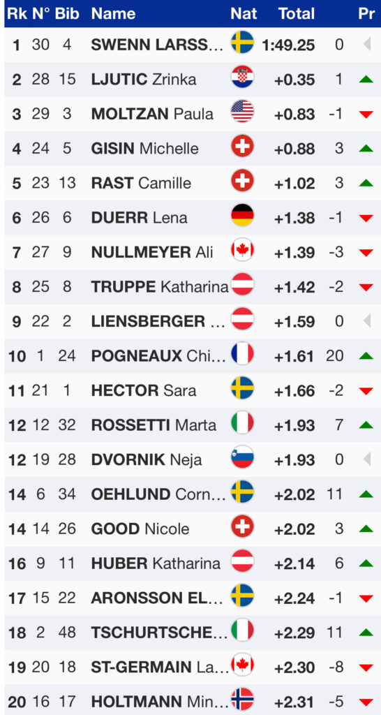 Na druhom mieste skončila Zrinka Ljutičová z Chorvátska, ktorá stratila 0,35 sekundy. Pódium uzavrela tretia Paula Moltzanová, Američanka mala v cieli manko 0,83 sekundy.